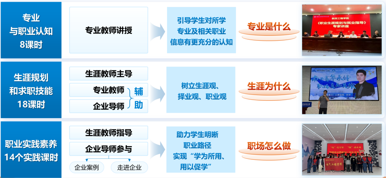 《职业生涯规划与就业指导》课程立足职业本科教育的“高等性”与“职业性”双重属性,深度融合类型教育特征,有机衔接学生专业对应的产业链、岗位群与技术发展路径。通过构建“专业认知-职业探索-决策规划-实践赋能”的螺旋式教学序列,引导学生在真实或模拟的职业情境中,逐步实现专业价值内化、职业定向明确与技术成长路径清晰,实现从“生手”到“熟手”的认知跃迁,为培养高素质技术技能人才奠定坚实的生涯发展基础。