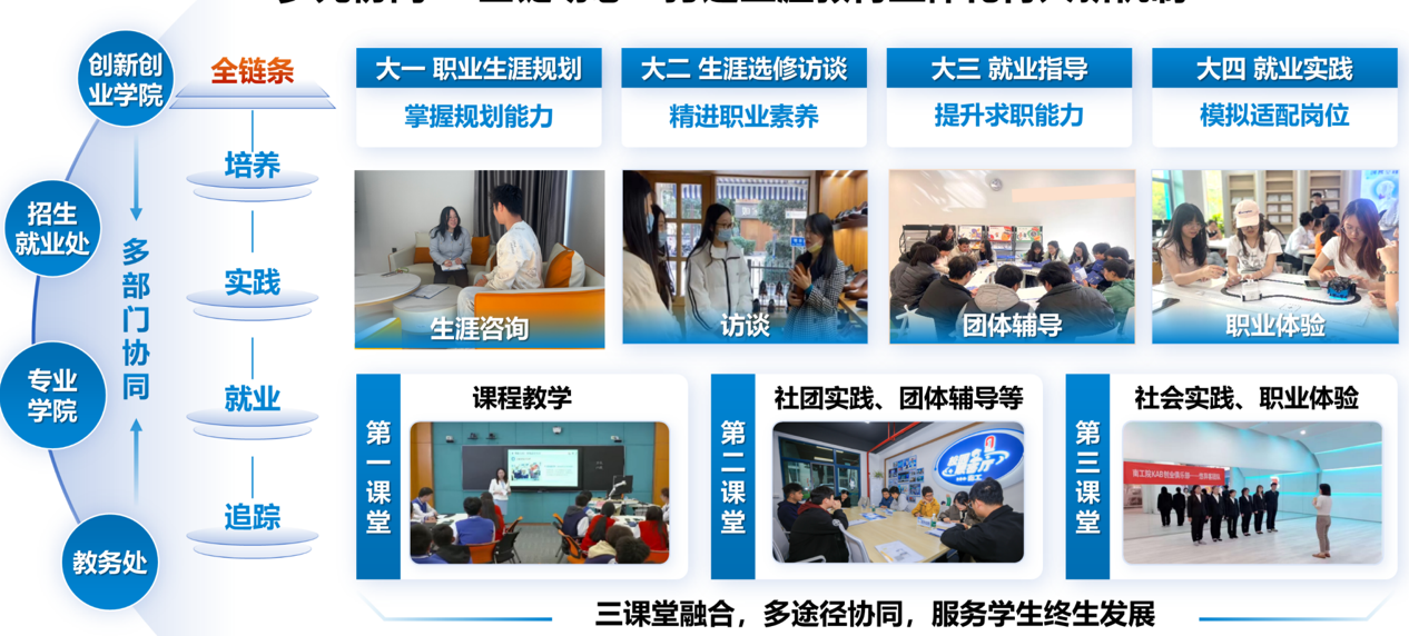 双创学院协同招就处、专业学院等部门,构建培养、实践、就业、追踪的全链条服务机制。大一侧重职业生涯规划,大二强化生涯选修、访谈,大三聚焦就业指导,大四开展就业实践。通过三课堂融合,生涯咨询、职业体验、项目实训等多途径协同推动就业,服务学生终身发展。