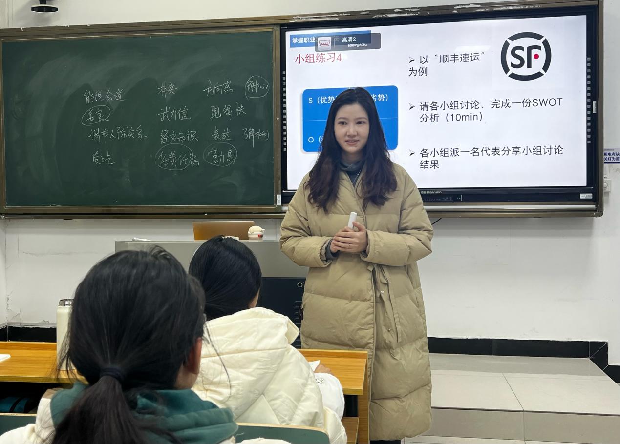 专业课教师承担课程前两次授课,引导学生在解决专业实际问题的过程中构建职业认知,推动课程内容与学生专业深度结合,系统分析对应职业群、岗位群及能力要求。例如,物流专业围绕“智慧物流”“绿色供应链”“全球供应链管理”等现代核心议题设计职业探索内容;电商专业覆盖“直播电商运营”“数据化营销”“用户增长策略”等前沿领域,实现职业规划与专业教育的有机融合。