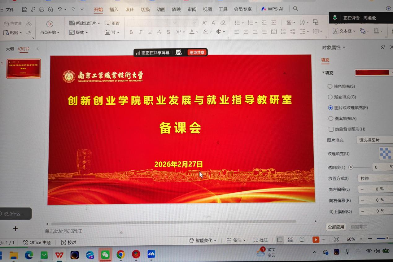 职业发展与就业指导教研室主任周媛媛首先介绍了新学期两门核心课程的整体教学计划,随后两门课程负责人分别对课程内容进行细致讲解,重点围绕本学期课程教学改进部分展开专项指导,同时与参会教师开展互动交流,并针对教学中的疑难问题逐一答疑解惑。最后,周媛媛对开学各项教学工作作出具体布置,要求全体授课教师扎实做好备课工作,严格遵照学校教学规范开展教学活动,以高标准、严要求保障教学质量。